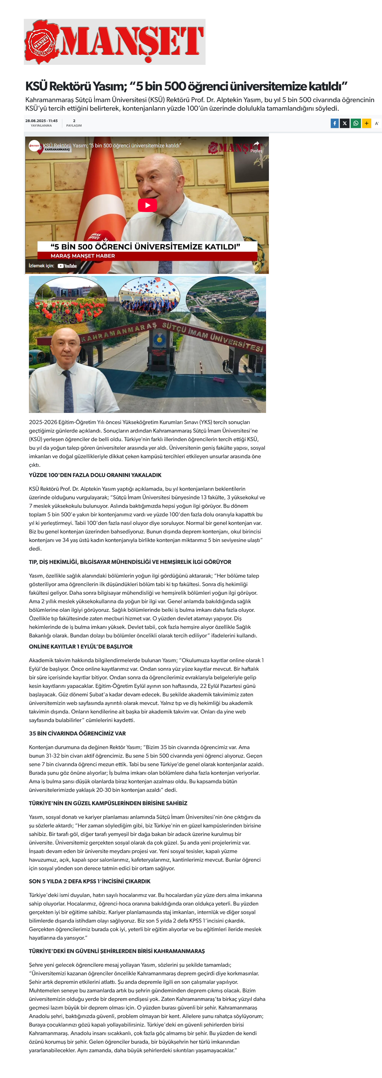 KSÜ Rektörü Yasım; “5 bin 500 öğrenci üniversitemize katıldı”